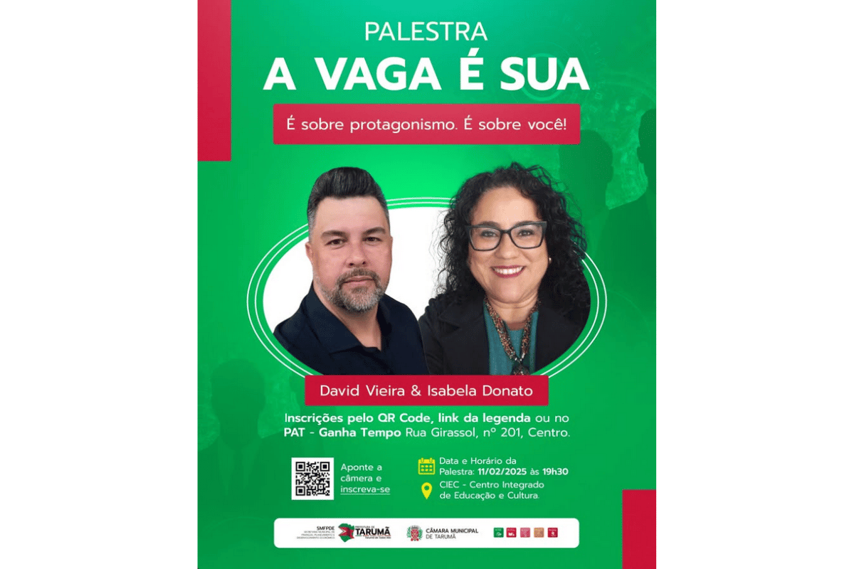 A cidade de Tarumã recebe, no dia 11 de fevereiro, quarta-feira, a palestra “A vaga é sua”, voltada a jovens e adultos que buscam o primeiro emprego ou desejam se recolocar no mercado de trabalho. O encontro será realizado às 19h30, no CIEC - Centro Integrado de Educação e Cultura, e tem como foco o protagonismo profissional e o desenvolvimento de competências valorizadas pelas empresas.