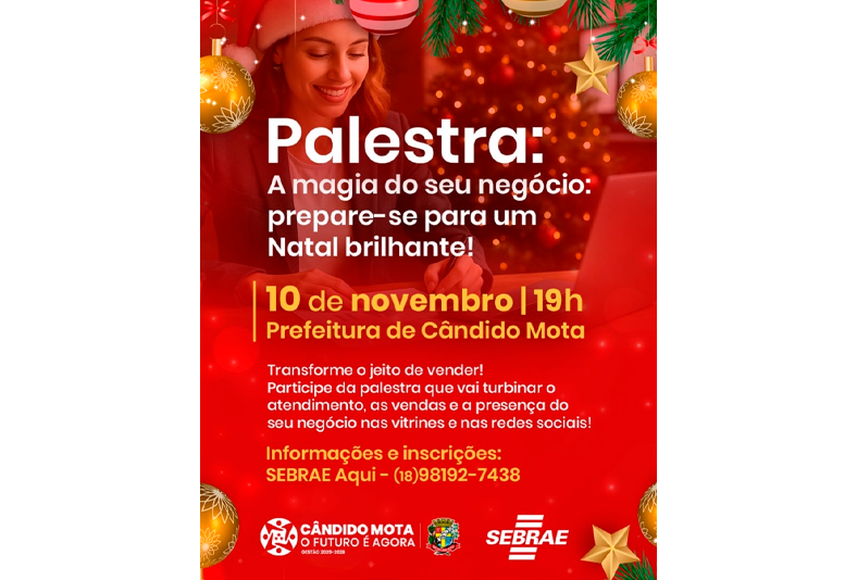 A Prefeitura de Cândido Mota, em parceria com o Sebrae Aqui, realiza na próxima segunda-feira, 10 de novembro, a palestra “A magia do seu negócio: prepare-se para um Natal brilhante!”, voltada a empreendedores e comerciantes locais. O encontro acontece às 19h, na Prefeitura de Cândido Mota.