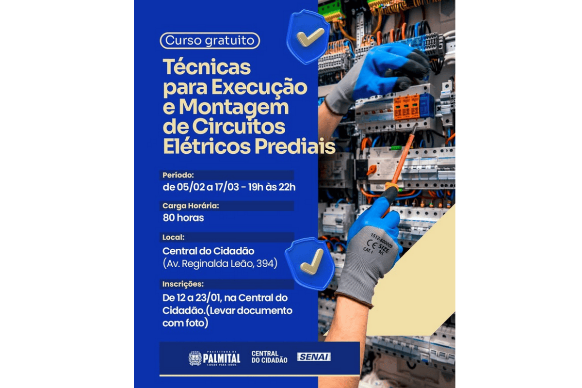 A Prefeitura de Palmital abriu inscrições para o curso gratuito Técnicas para Execução e Montagem de Circuitos Elétricos Prediais, realizado em parceria com o SENAI. A iniciativa integra as ações de qualificação profissional do município e busca ampliar oportunidades de inserção no mercado de trabalho.
