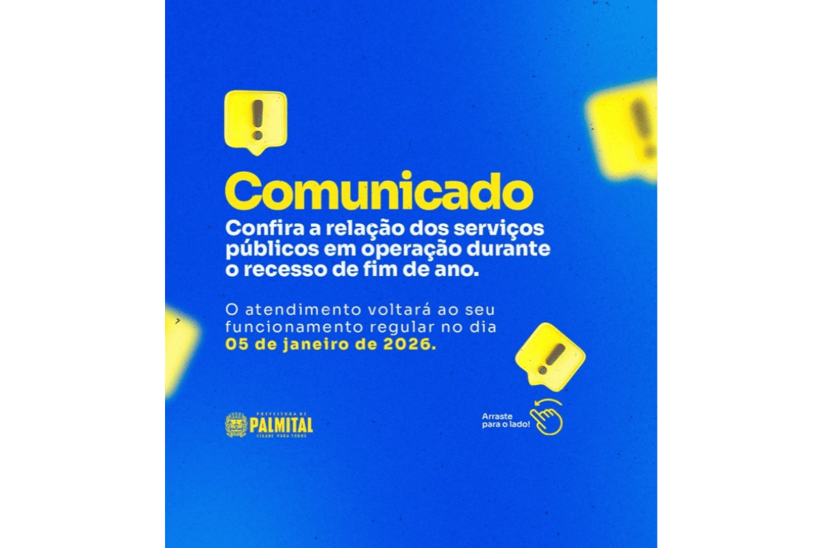 A Prefeitura de Palmital divulgou como ficará o funcionamento dos serviços públicos durante o recesso de fim de ano. Algumas repartições encerram as atividades administrativas nesta sexta-feira, 19 de dezembro, e retomam o expediente normal no dia 5 de janeiro de 2026, enquanto serviços essenciais seguem operando em regime especial entre os dias 22 de dezembro e 2 de janeiro.