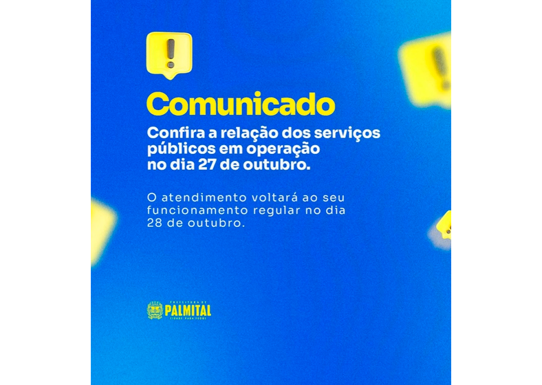 Em razão da antecipação do ponto facultativo referente ao Dia do Servidor Público, a Prefeitura de Palmital divulgou a lista de serviços municipais que continuarão em funcionamento nesta segunda-feira, 27 de outubro. O atendimento regular nos demais setores será retomado na terça-feira, dia 28.