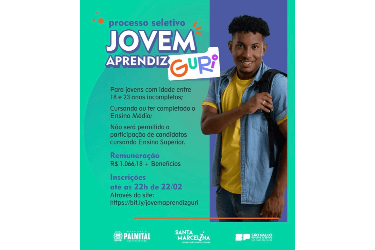 Terminam às 22h deste domingo, 22 de fevereiro, as inscrições para o processo seletivo do programa Jovem Aprendiz do Guri, em Palmital. A oportunidade é destinada a jovens de 18 a 23 anos incompletos e oferece remuneração de R$ 1.066,18, além de benefícios, para atuação na área administrativa do polo local do Projeto Guri.