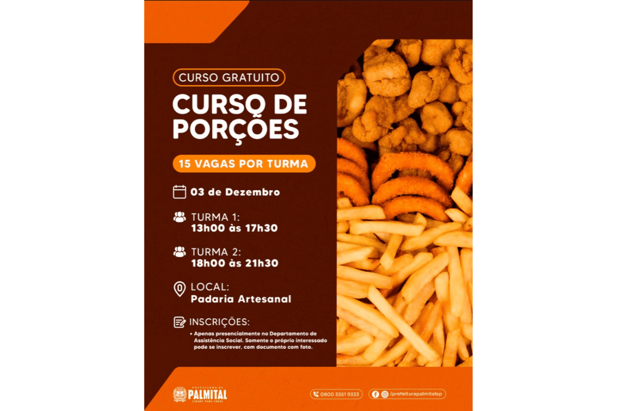 A Prefeitura de Palmital anunciou a abertura de um curso gratuito voltado ao preparo de porções práticas, destinado a moradores interessados em adquirir novas habilidades culinárias e ampliar oportunidades de renda. As aulas acontecem no dia 3 de dezembro, na Padaria Artesanal, com duas turmas disponíveis: das 13h às 17h30 e das 18h às 21h30. Cada turma terá 15 vagas.