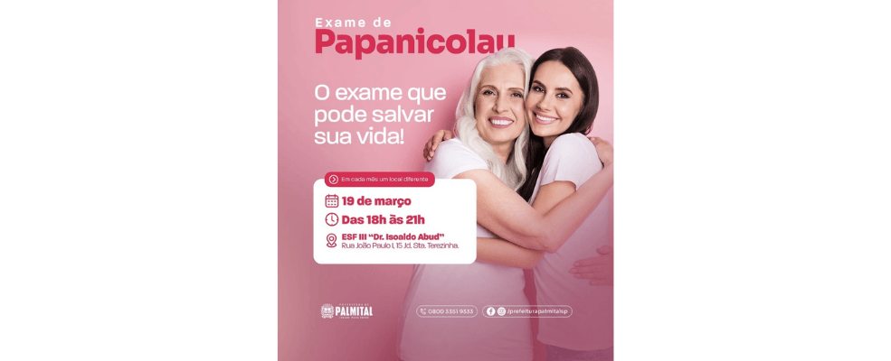 A Prefeitura de Palmital realizará na noite da próxima quinta-feira, dia 19 de março, uma ação de prevenção ao câncer de colo do útero com a oferta do exame de Papanicolau em horário noturno. O atendimento acontecerá das 18h às 21h na unidade ESF III Dr. Isoaldo Abud, localizada na Rua João Paulo I, 15, no Jardim Santa Terezinha.