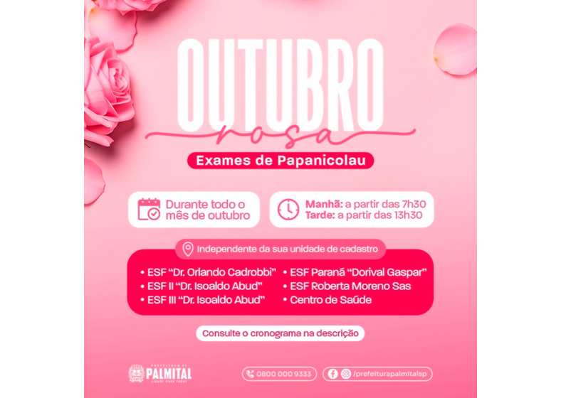 Durante todo o mês de outubro, a Prefeitura de Palmital realiza a campanha de exames de Papanicolau em alusão ao Outubro Rosa, com atendimentos gratuitos em diferentes unidades de saúde da cidade. A iniciativa busca incentivar a prevenção e o diagnóstico precoce do câncer de colo de útero, uma das principais causas de morte entre mulheres no Brasil.