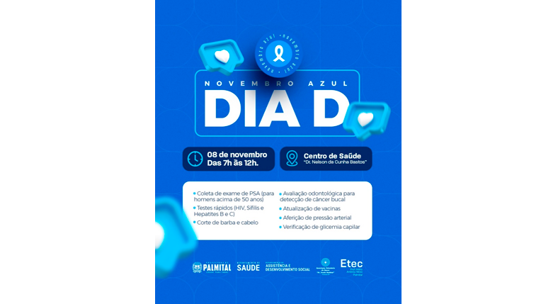 A Prefeitura de Palmital, por meio do Departamento de Saúde e da Assistência e Desenvolvimento Social, realiza neste sábado, 8 de novembro, o Dia D da Saúde Masculina, dentro da campanha Novembro Azul. A ação acontece no Centro de Saúde Dr. Nelson da Cunha Bastos, localizado na Rua Francisco Severino da Costa, 677, das 7h às 12h.