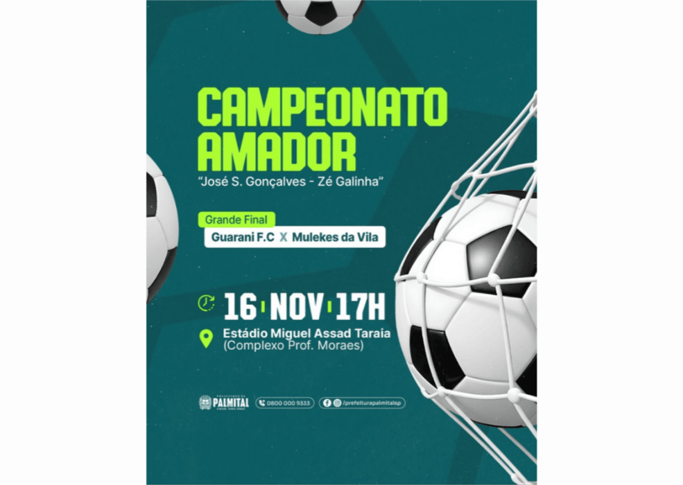 Após quase três meses de disputas e seis equipes em campo, o Campeonato Amador “José Sebastião Gonçalves – Zé Galinha” chega à grande final neste domingo, 16 de novembro, em Palmital. A partida decisiva será entre Guarani F.C. e Mulekes da Vila, às 17h, no Estádio Miguel Assad Taraia (Complexo Prof. Moraes).