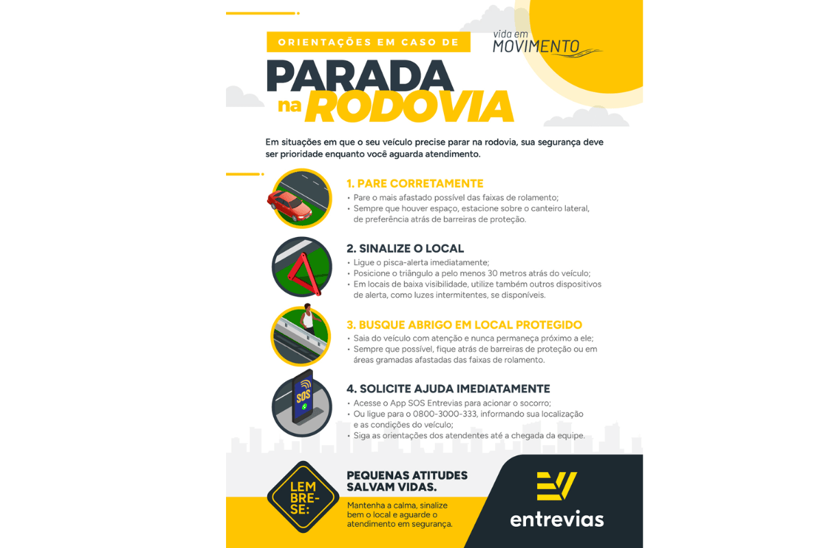 A Entrevias reforça que pequenas atitudes podem salvar vidas e lembra que os condutores devem manter a calma, sinalizar corretamente o local e aguardar o atendimento em segurança.