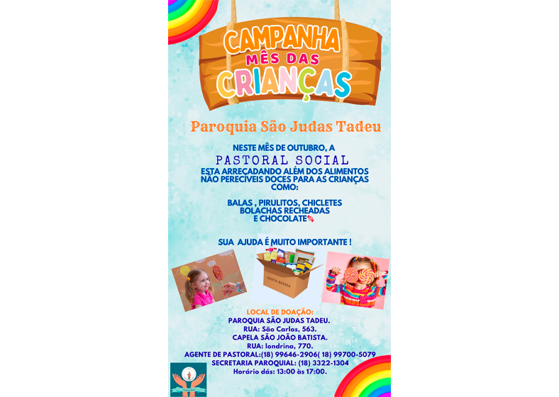 Durante todo o mês de outubro, a Paróquia São Judas Tadeu, em Assis, realiza uma campanha solidária especial em comemoração ao Mês das Crianças. A iniciativa é organizada pela Pastoral Social e tem como objetivo arrecadar alimentos não perecíveis e doces que serão destinados às famílias atendidas e às crianças da comunidade.