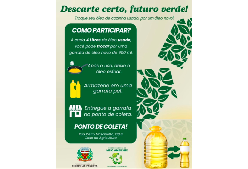 A Prefeitura de Pedrinhas Paulista, por meio da Secretaria de Obras e Serviços, Agricultura e Meio Ambiente, lançou o projeto “Óleo por Óleo”, com o objetivo de promover o descarte correto do óleo de cozinha usado e incentivar práticas de educação ambiental no município.