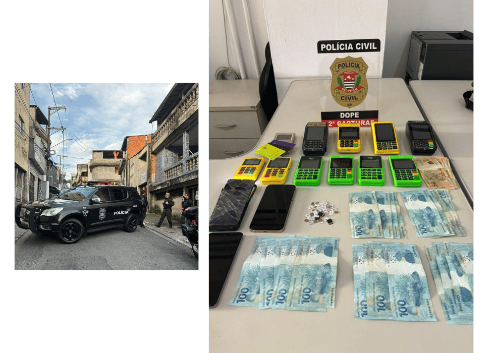 A operação mobilizou 64 policiais civis, distribuídos em oito equipes do Deinter-8 e oito equipes do Decap, com apoio de 16 viaturas. Até o momento, cinco dos sete mandados de prisão temporária foram cumpridos, além da apreensão de dispositivos eletrônicos, máquinas de cartão e valores em dinheiro. As diligências continuam.