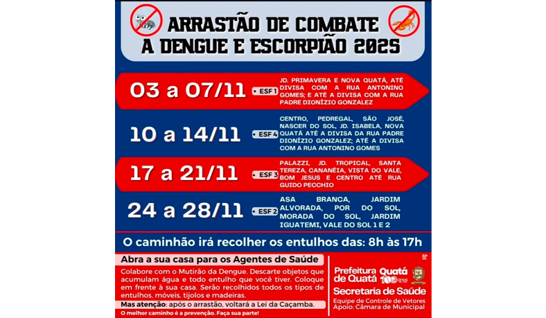 A Prefeitura de Quatá, por meio da Secretaria Municipal de Saúde e da equipe de Controle de Vetores, realizará entre os dias 3 e 28 de novembro o Arrastão de Combate à Dengue e ao Escorpião 2025. A ação tem como objetivo eliminar criadouros do mosquito Aedes aegypti e reduzir os riscos de acidentes com escorpiões, reforçando o cuidado com a saúde pública e a prevenção de doenças.