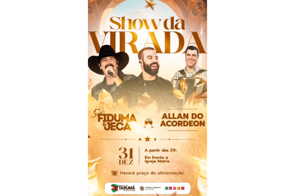 A cidade de Tarumã já se prepara para a chegada de 2026 com a realização do tradicional Show da Virada, marcado para o dia 31 de dezembro, a partir das 21h, em frente à Igreja Matriz. O evento, promovido pela Prefeitura de Tarumã em parceria com a Câmara Municipal, contará com atrações musicais confirmadas e estrutura preparada para receber o público no centro da cidade.