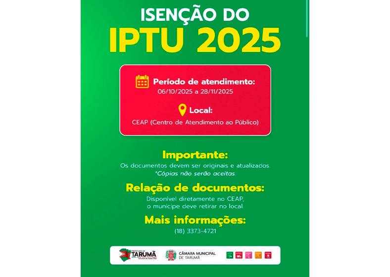 Desde a última segunda-feira, 6 de outubro, a Prefeitura de Tarumã está recebendo os pedidos de isenção do IPTU 2025, benefício voltado a contribuintes que se enquadram nos critérios estabelecidos pela legislação municipal. O atendimento acontece no Centro de Atendimento ao Público (CEAP) e segue até o dia 28 de novembro.