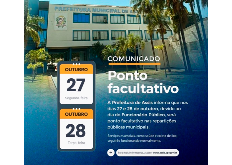 A Prefeitura de Assis informa que, em razão do Dia do Servidor Público, comemorado em 28 de outubro, foi decretado ponto facultativo nos dias 27 (segunda-feira) e 28 (terça-feira). Durante o período, o expediente estará suspenso em repartições e secretarias municipais, com retorno das atividades na quarta-feira, dia 29 de outubro.