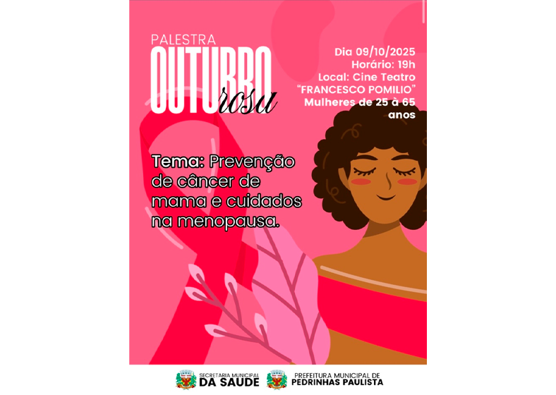 A Prefeitura Municipal de Pedrinhas Paulista, por meio da Secretaria de Saúde, realiza nesta quinta-feira, 9 de outubro, às 19h, no Cine Teatro “Francesco Pomilio”, uma palestra especial da campanha Outubro Rosa, com o tema “Prevenção do Câncer de Mama e Cuidados na Menopausa”.