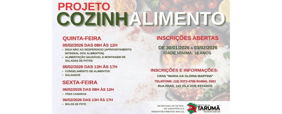 A Prefeitura de Tarumã abriu nesta quinta-feira, dia 30 de janeiro, as inscrições para as oficinas do Projeto Cozinhalimento, iniciativa voltada à capacitação, ao empreendedorismo e à geração de renda por meio da alimentação. As atividades acontecem nos dias 5 e 6 de fevereiro, no CRAS Maria da Glória Martins, e são destinadas a pessoas com idade mínima de 16 anos.
