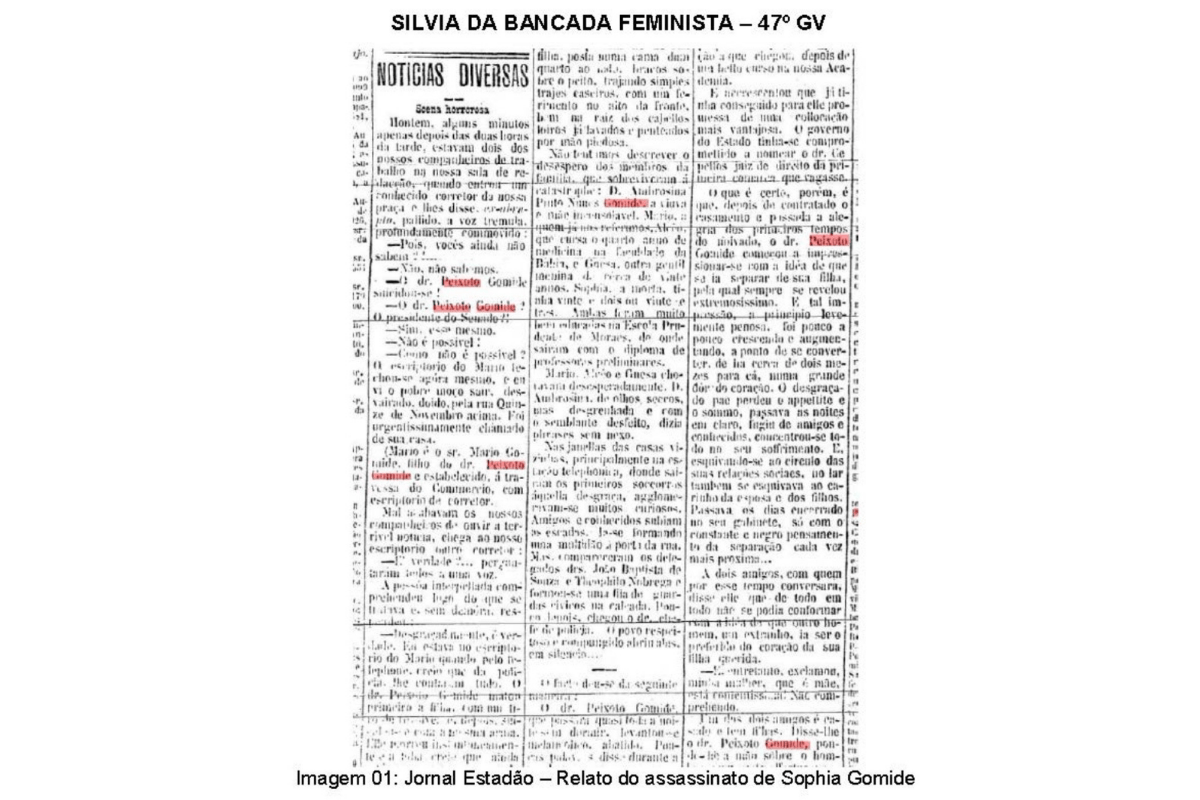 A proposta é de autoria das vereadoras Luna Zarattini e Silvia da Bancada Feminista, e tem como objetivo promover uma reparação histórica ao substituir o nome atual do logradouro pelo de Sophia Gomide, jovem assassinada pelo próprio pai em 1906.