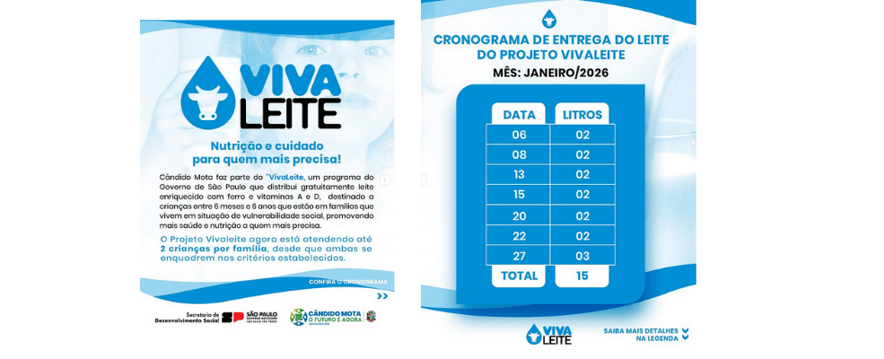 O Projeto Vivaleite segue ativo em Cândido Mota e já tem cronograma definido para janeiro de 2026, beneficiando crianças de 6 meses a 6 anos que vivem em famílias em situação de vulnerabilidade social. A iniciativa é resultado da parceria entre o Governo do Estado de São Paulo e a Prefeitura, por meio da Secretaria Municipal de Assistência Social, e tem como foco reforçar a nutrição infantil na primeira infância.