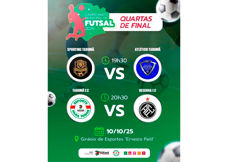 A emoção do Campeonato Municipal de Futsal 2025 chega à fase decisiva nesta sexta-feira, 10 de outubro, em Tarumã. O Ginásio de Esportes Ernesto Paitl será palco das quartas de final da competição, com dois grandes duelos que prometem movimentar a torcida e garantir uma noite de futsal de alto nível.