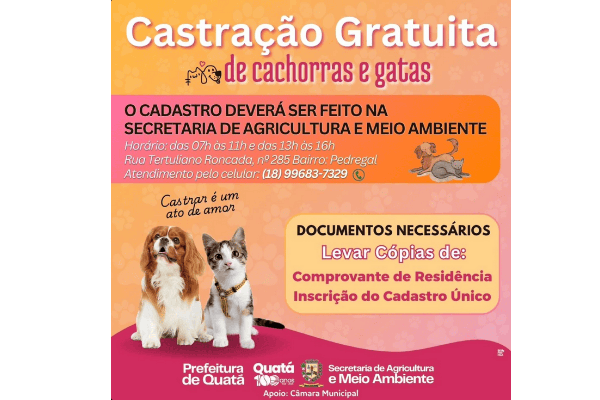A ação é desenvolvida pela Secretaria de Agricultura e Meio Ambiente, com apoio da Prefeitura de Quatá e da Câmara Municipal. Além de contribuir para a redução do abandono, a castração é considerada medida essencial para a prevenção de doenças e para a melhoria da qualidade de vida dos animais.
