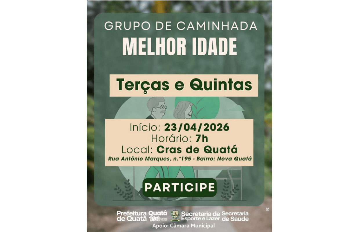 A Prefeitura de Quatá inicia, na próxima quinta-feira, dia 23 de abril, um grupo de caminhada voltado à melhor idade. A atividade será realizada semanalmente, sempre às terças e quintas-feiras, com início às 7h, no CRAS de Quatá, localizado na Rua Antônio Marques, 195, no bairro Nova Quatá.