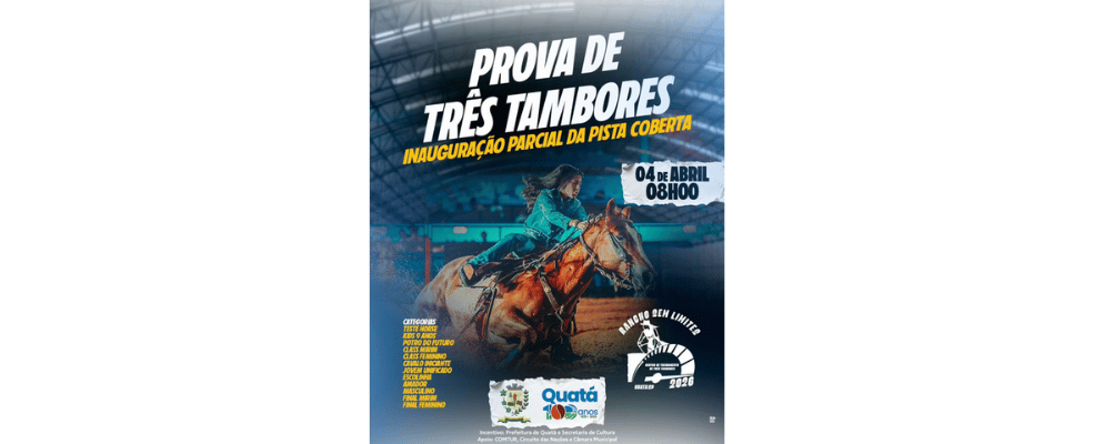 A agenda começa no sábado, dia 4 de abril, com a realização da prova de três tambores, marcada para às 8h, no Rancho Sem Limite. O evento integra a inauguração parcial da pista coberta e reúne competidores em diversas categorias, como test horse, kids, jovem, amador e feminino.