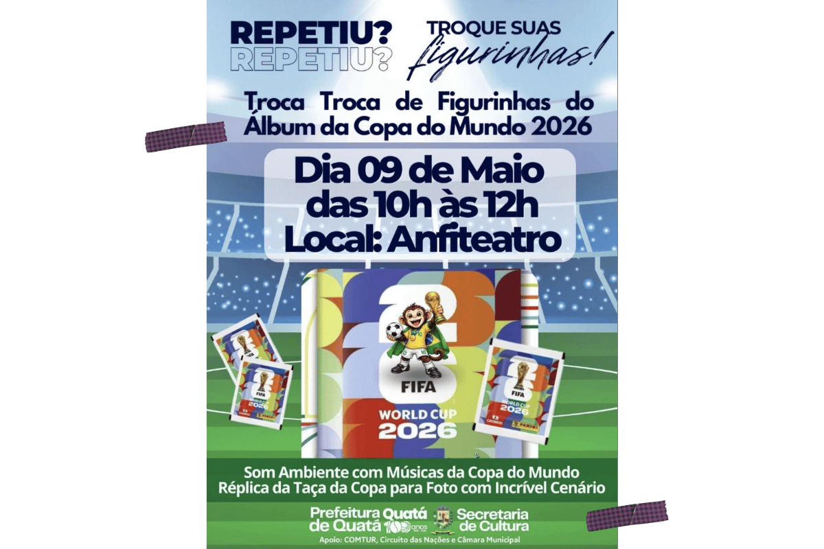 A cidade de Quatá já entrou no clima da Copa do Mundo de 2026 e começa a organizar uma das tradições mais populares entre crianças, jovens e adultos: a troca de figurinhas do álbum oficial. O encontro está marcado para o dia 9 de maio, sábado, véspera do Dia das Mães, das 10h às 12h, no Anfiteatro.