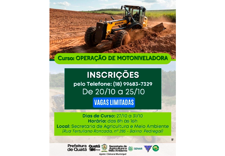 A Prefeitura de Quatá, por meio da Secretaria de Agricultura e Meio Ambiente, em parceria com o SENAR e o Sindicato Rural de Quatá, está com inscrições abertas para o curso gratuito de Operação de Motoniveladora. A capacitação será realizada entre os dias 27 e 31 de outubro, das 8h às 16h, na sede da secretaria, localizada na Rua Tertuliano Roncada, 285, bairro Pedregal.