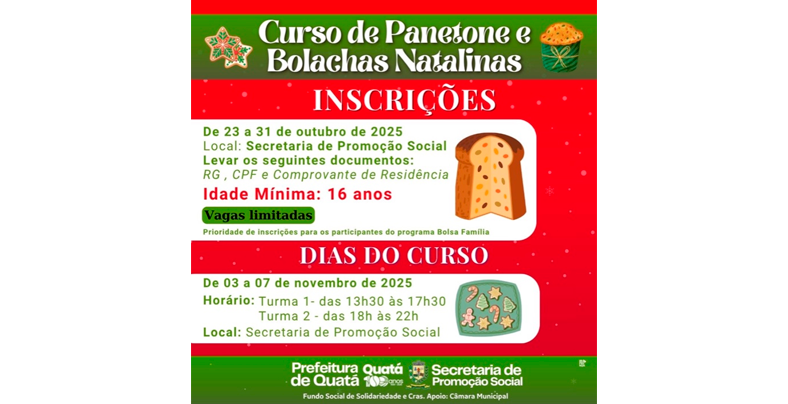 A Prefeitura de Quatá, por meio da Secretaria de Promoção Social, abriu inscrições para o curso gratuito “Panetone e Bolachas Natalinas”, que será realizado entre os dias 3 e 7 de novembro de 2025, na sede da secretaria. A iniciativa integra o Fundo Social de Solidariedade e oferece uma oportunidade de capacitação voltada à geração de renda no período de festas de fim de ano.