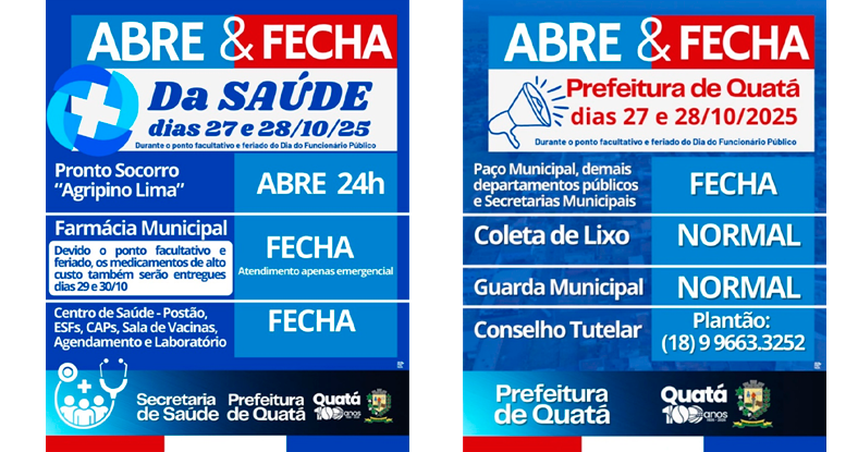 A Prefeitura de Quatá divulgou como será o funcionamento dos serviços municipais nos dias 27 e 28 de outubro de 2025, período de ponto facultativo em razão do Dia do Servidor Público. O expediente nas repartições e secretarias municipais será suspenso, com retorno das atividades na quarta-feira, dia 29.