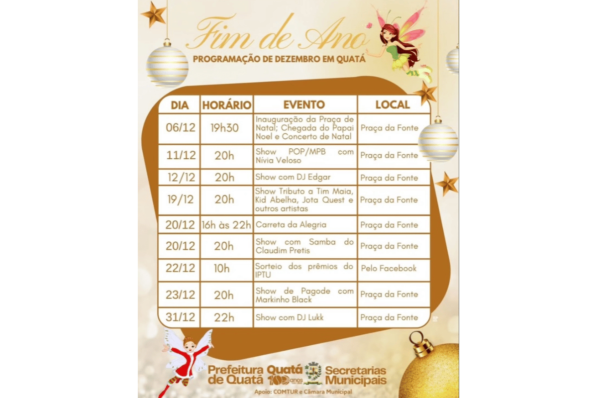 A Prefeitura de Quatá divulgou a programação oficial de fim de ano que será realizada entre os dias 6 e 31 de dezembro, com shows, atrações culturais, chegada do Papai Noel e ações especiais na Praça da Fonte e no Facebook da administração. A iniciativa reúne atividades abertas ao público e celebrações voltadas à comunidade ao longo de todo o mês.