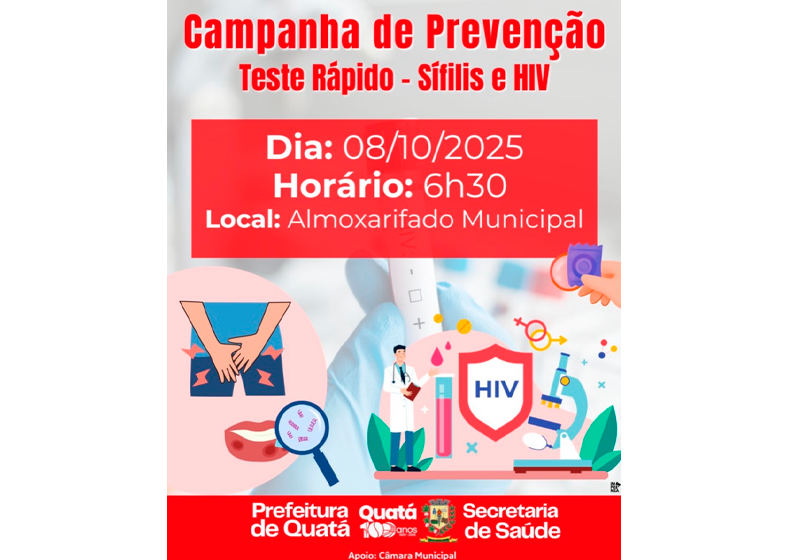 Na próxima quarta-feira, 8 de outubro, a Prefeitura de Quatá, por meio da Secretaria Municipal de Saúde, realiza uma campanha de prevenção com a oferta de testes rápidos para detecção de sífilis e HIV. A ação será no Almoxarifado Municipal, com início às 6h30, e é aberta à população.