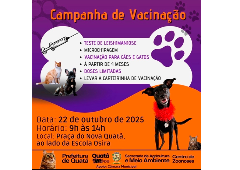 A Prefeitura de Quatá, por meio da Secretaria de Agricultura e Meio Ambiente e do Centro de Zoonoses, realiza na quarta-feira, dia 22 de outubro, uma nova edição da Campanha de Vacinação Animal. O atendimento será das 9h às 14h, na Praça do Nova Quatá, ao lado da Escola Osira.