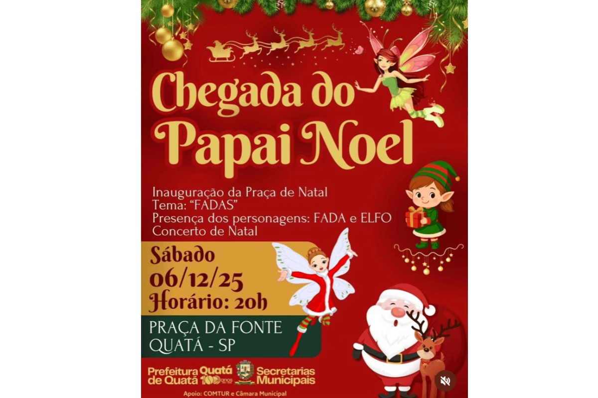 A cidade de Quatá realiza neste sábado, dia 6 de dezembro, às 20h, a abertura oficial das celebrações natalinas com a chegada do Papai Noel na Praça da Fonte, evento que marca também a inauguração da Praça de Natal, apresentação do tema Fadas e participação de personagens, incluindo fada e elfo, além de concerto especial preparado para a data.