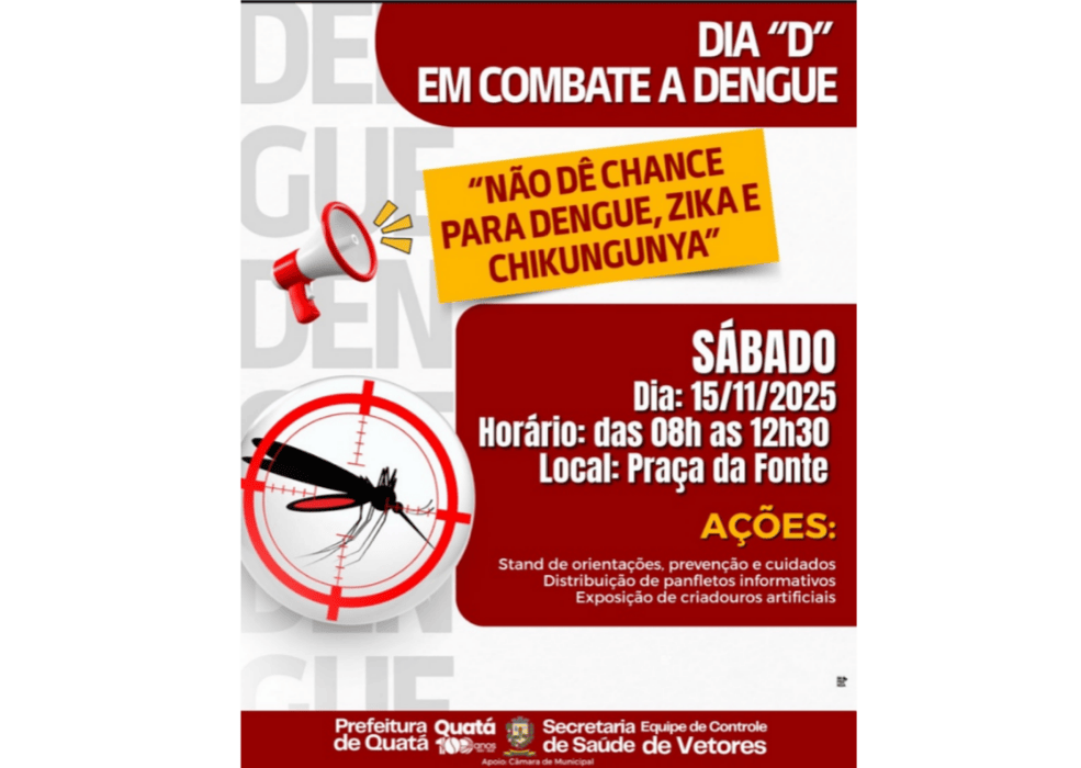 A Prefeitura de Quatá, por meio da Secretaria Municipal de Saúde e da Equipe de Controle de Vetores, promove neste sábado, 15 de novembro de 2025, o Dia D de combate à dengue, com o tema “Não dê chance para dengue, zika e chikungunya”.