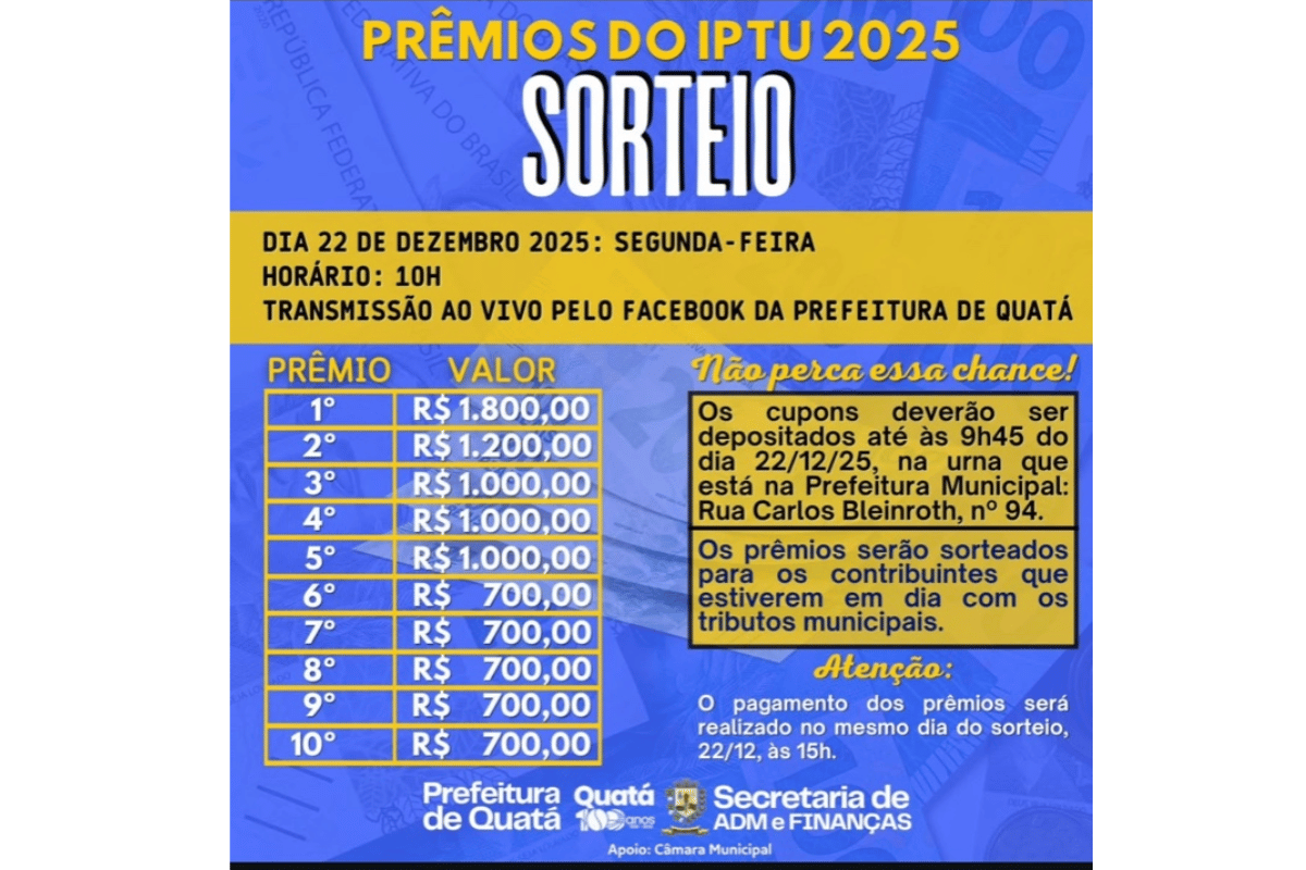 A Prefeitura de Quatá realiza no dia 22 de dezembro, segunda-feira, às 10h, o sorteio dos prêmios do IPTU 2025, com transmissão ao vivo pelo Facebook oficial do município. A participação é aberta aos contribuintes que estiverem em dia com os tributos municipais e que depositarem os cupons na urna instalada na Prefeitura.