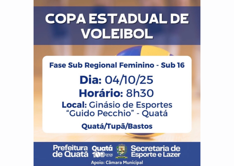 Neste sábado, 4 de outubro de 2025, a cidade de Quatá será sede da fase sub-regional da Copa Estadual de Voleibol Feminino Sub-16. A competição acontece a partir das 8h30 no Ginásio de Esportes Guido Pecchio e reunirá equipes representantes de Quatá, Tupã e Bastos.