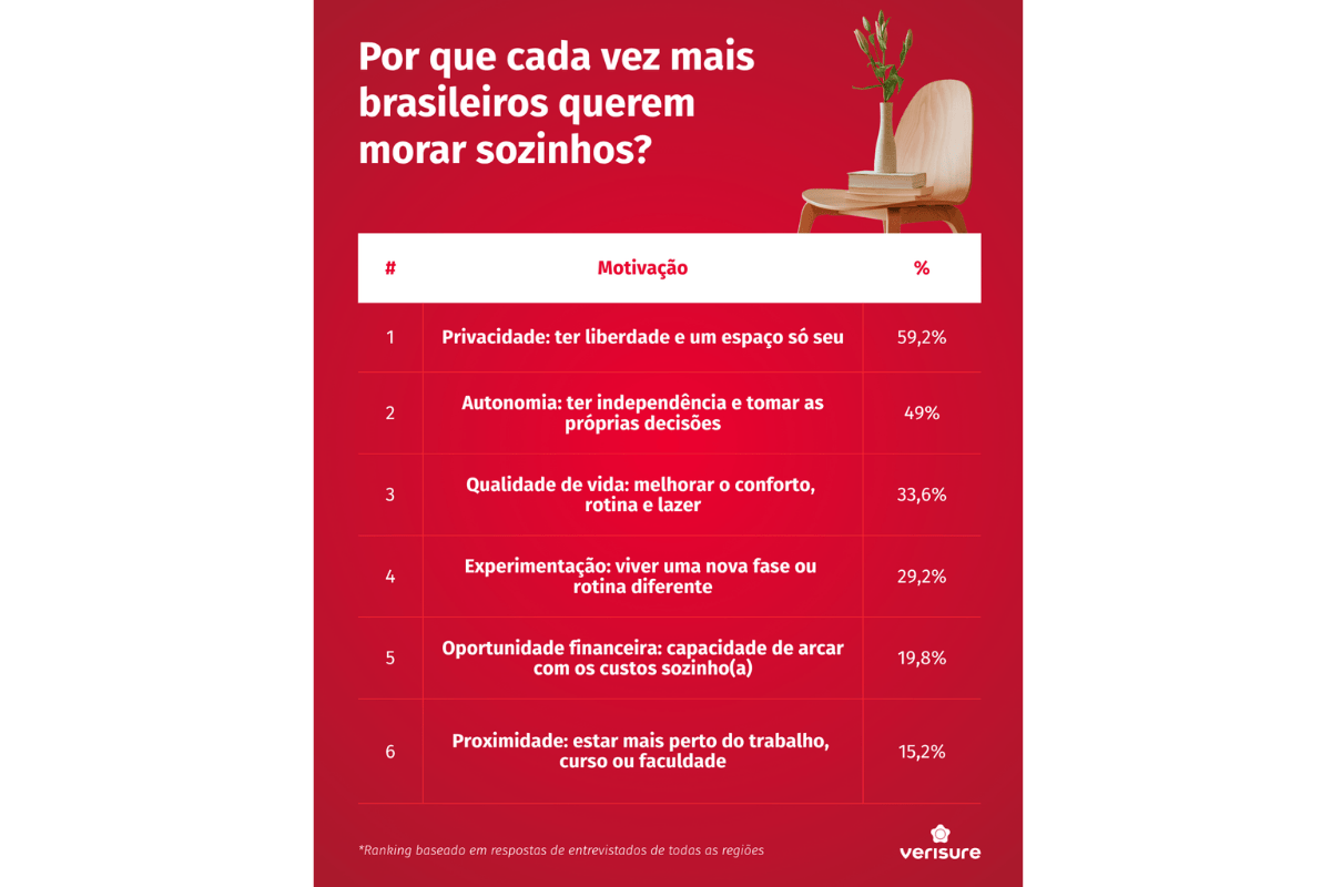 Entre os principais motivos que levam a essa escolha, a busca por privacidade aparece em primeiro lugar, citada por 59,2% dos entrevistados. Em seguida, estão a autonomia para tomar decisões (49%) e a melhoria da qualidade de vida, com mais conforto, organização e lazer (33,6%).