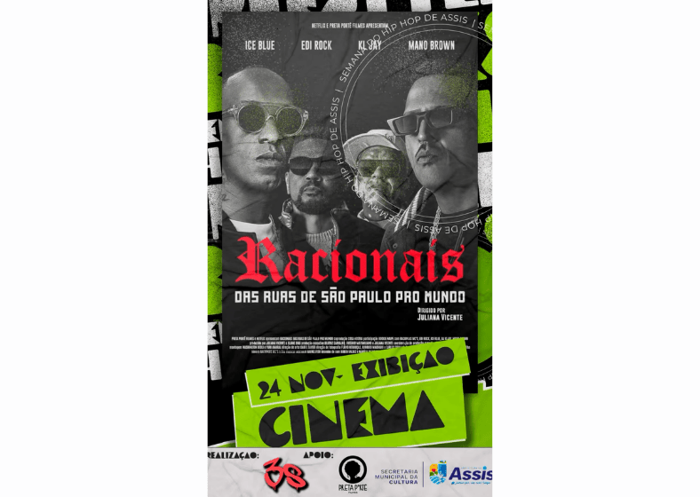A exibição gratuita do documentário “Racionais: Das Ruas de São Paulo pro Mundo” acontece na segunda-feira, 24 de novembro, no Cine Fema Piracaia, em Assis, como parte da programação da 1ª Semana do Hip Hop da cidade. O evento reforça o acesso ao cinema e celebra a trajetória de um dos grupos mais importantes da música brasileira.