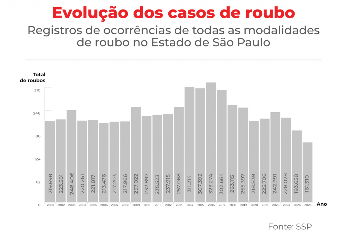 Em 2025, as delegacias registraram 161.310 boletins de ocorrência relacionados a crimes dessa natureza, uma queda de 16,7% na comparação com 2024, quando foram contabilizados 193.658 casos. Para efeito de comparação, todos os anos anteriores superaram a marca de 200 mil registros no fechamento anual.