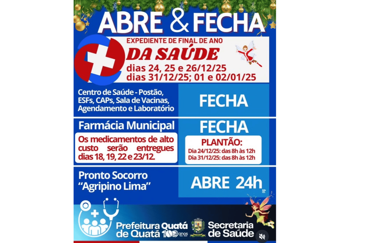 A Farmácia Municipal também permanecerá fechada nessas datas. No entanto, a Secretaria de Saúde informa que os medicamentos de alto custo serão entregues antecipadamente, nos dias 18, 19, 22 e 23 de dezembro, para evitar prejuízos aos pacientes que dependem do uso contínuo.
