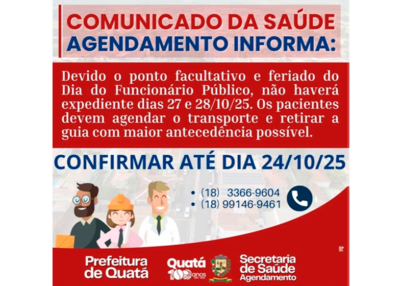 A Secretaria Municipal de Saúde de Quatá informou que, devido ao ponto facultativo e ao feriado do Dia do Servidor Público, não haverá expediente nos dias 27 e 28 de outubro.