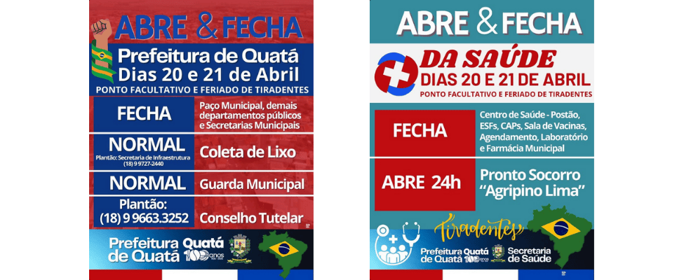 A Prefeitura de Quatá divulgou o funcionamento dos serviços públicos municipais durante o ponto facultativo e o feriado de Tiradentes, nos dias 20 e 21 de abril. No período, parte dos atendimentos será suspensa, enquanto serviços essenciais seguem operando normalmente.