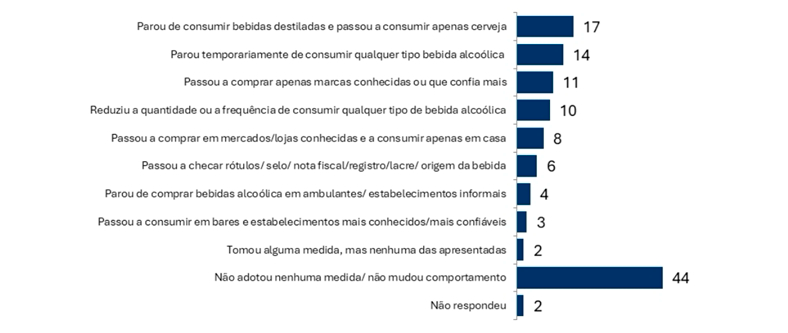 Segundo a Ipsos-Ipec, 94% da população tomou conhecimento dos casos recentes de intoxicação por bebidas adulteradas com metanol, sendo a mídia tradicional (72%) a principal fonte de informação, seguida pelas redes sociais (52%). Entre os consumidores de bebidas, 54% disseram ter adotado alguma medida preventiva, como parar de consumir bebidas destiladas e optar apenas por cerveja (17%) ou suspender temporariamente o consumo de qualquer bebida alcoólica (14%). No entanto, 44% não alteraram o comportamento mesmo após os casos de intoxicação.