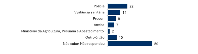 A pesquisa também mostra que metade dos brasileiros não sabe para qual órgão recorrer em caso de suspeita de adulteração. Entre as respostas espontâneas, 22% mencionaram a Polícia e 14% a Vigilância Sanitária, enquanto 9% não souberam responder.
