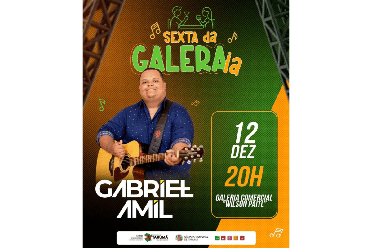 A Prefeitura de Tarumã realiza, no dia 12 de dezembro, mais uma edição da Sexta da Galeria, evento que acontece a partir das 20h na Galeria Comercial Wilson Paitl. A atração da noite será o cantor Gabriel Amil, que retorna ao município com repertório voltado à música popular e clima festivo para animar o público.