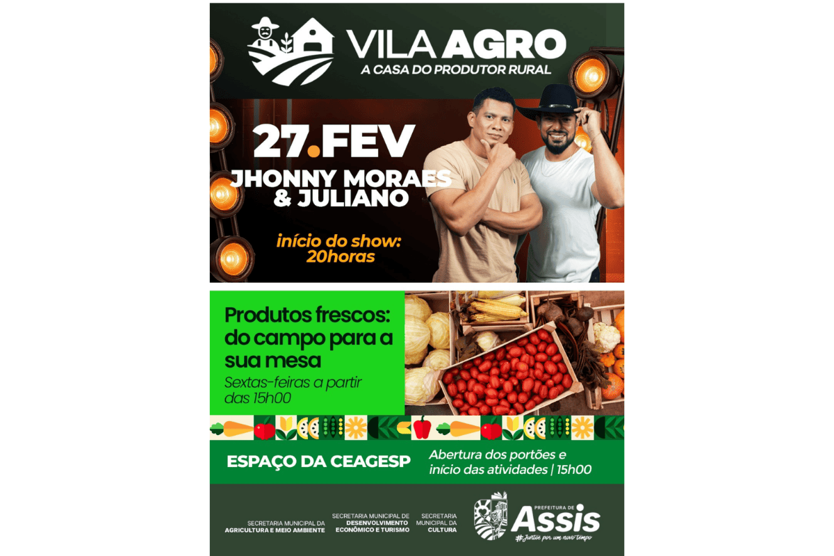 A Vila Agro realiza mais uma edição nesta sexta-feira, 27 de fevereiro, em Assis, com abertura dos portões às 15h no Espaço da Ceagesp. O evento reúne produtores rurais, comércio local e programação cultural, incluindo show da dupla Jhonny Moraes e Juliano a partir das 20h.