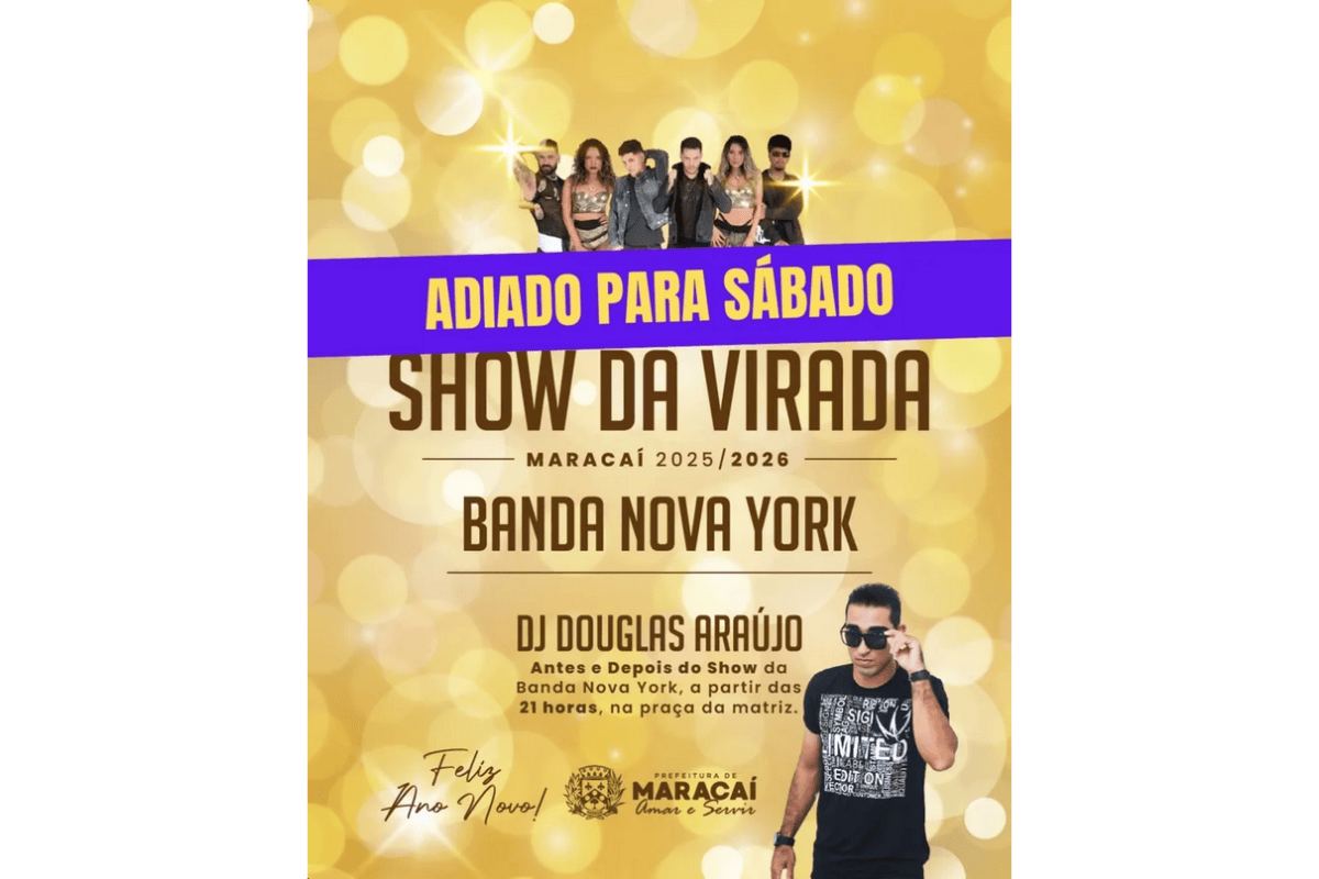 O Show da Virada em Maracaí será realizado neste sábado, 3 de janeiro de 2026, após ter sido adiado na noite de Réveillon em razão das fortes chuvas e dos danos causados aos equipamentos de som. A decisão foi tomada para preservar a qualidade técnica do evento e assegurar melhores condições para artistas e público.