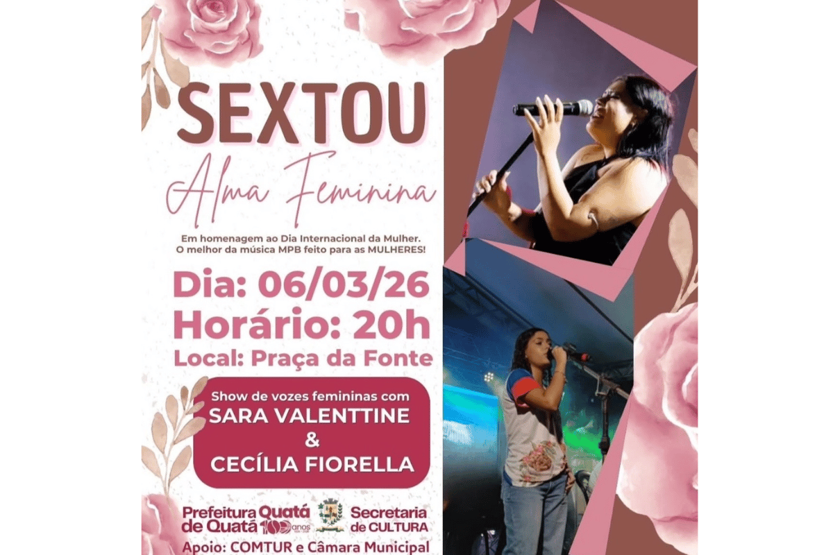 A Prefeitura de Quatá realiza na sexta-feira, 6 de março, às 20h, o show “Sextou Alma Feminina”, em homenagem ao Dia Internacional da Mulher. O evento será na Praça da Fonte e terá entrada gratuita.